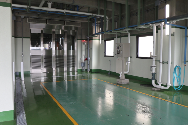 (1)受入室の前後に前室・後室を設け、臭気の拡散を防止すると共に、エアカーテンを設置し臭気の外部への 流出を防いでいます。 (2)水槽類を密閉構造とし、臭気の拡散を防止しています。 (3)臭気処理は、臭気濃度ごとに区分し、効率的な脱臭対策を採用しています。また、その他についても処理 のプロセスや装置の構造面から万全を期しています。
